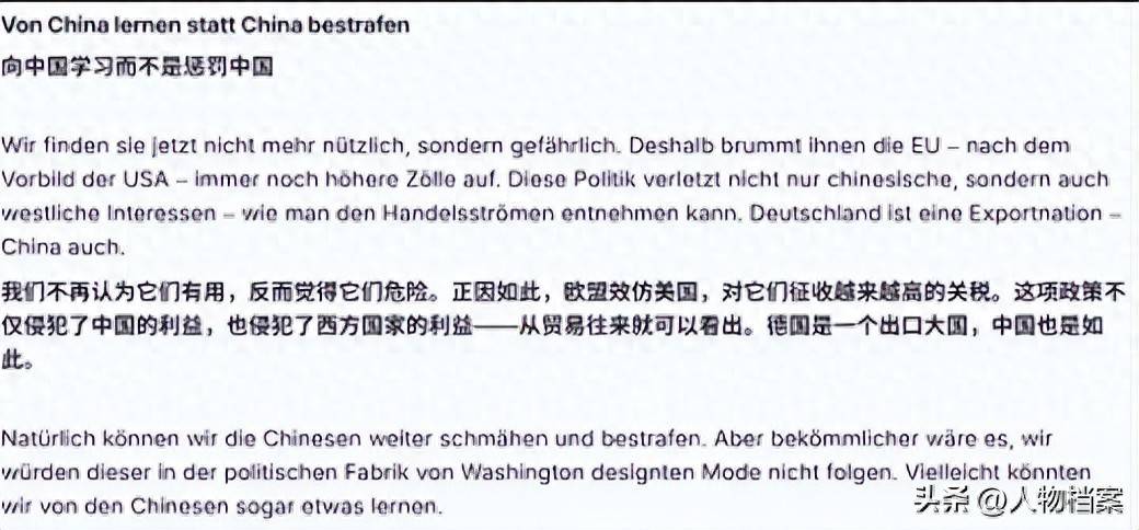 施泰因加特正在评论中则进一步指出,德邦交际政策的问题根源不正在于中国发生了变化,而正在于德国对待中国的视角发生了扭曲。这种视角的误差导致政策进入了一个背道而驰的窘境——德国试图通过加征关税。